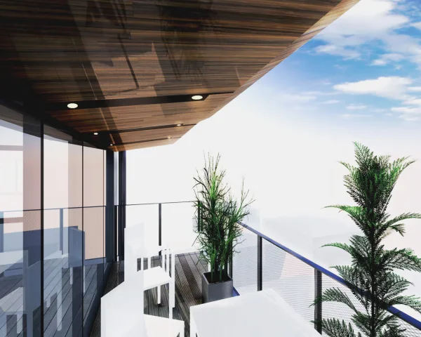 小規模オフィスでは、隅に追いやられるバルコニーをあえて広くとり、外部空間でアウトサイドリビングのようにソファを置いてくつろいだり、外の空気を感じながらゆったり仕事ができる。そんな様子が表れるファサードにした。木調パネルを軒裏に使い、日本人の風土・文化になじみ深く、落ち着くファサードを目指した。