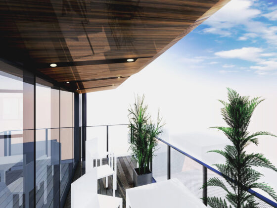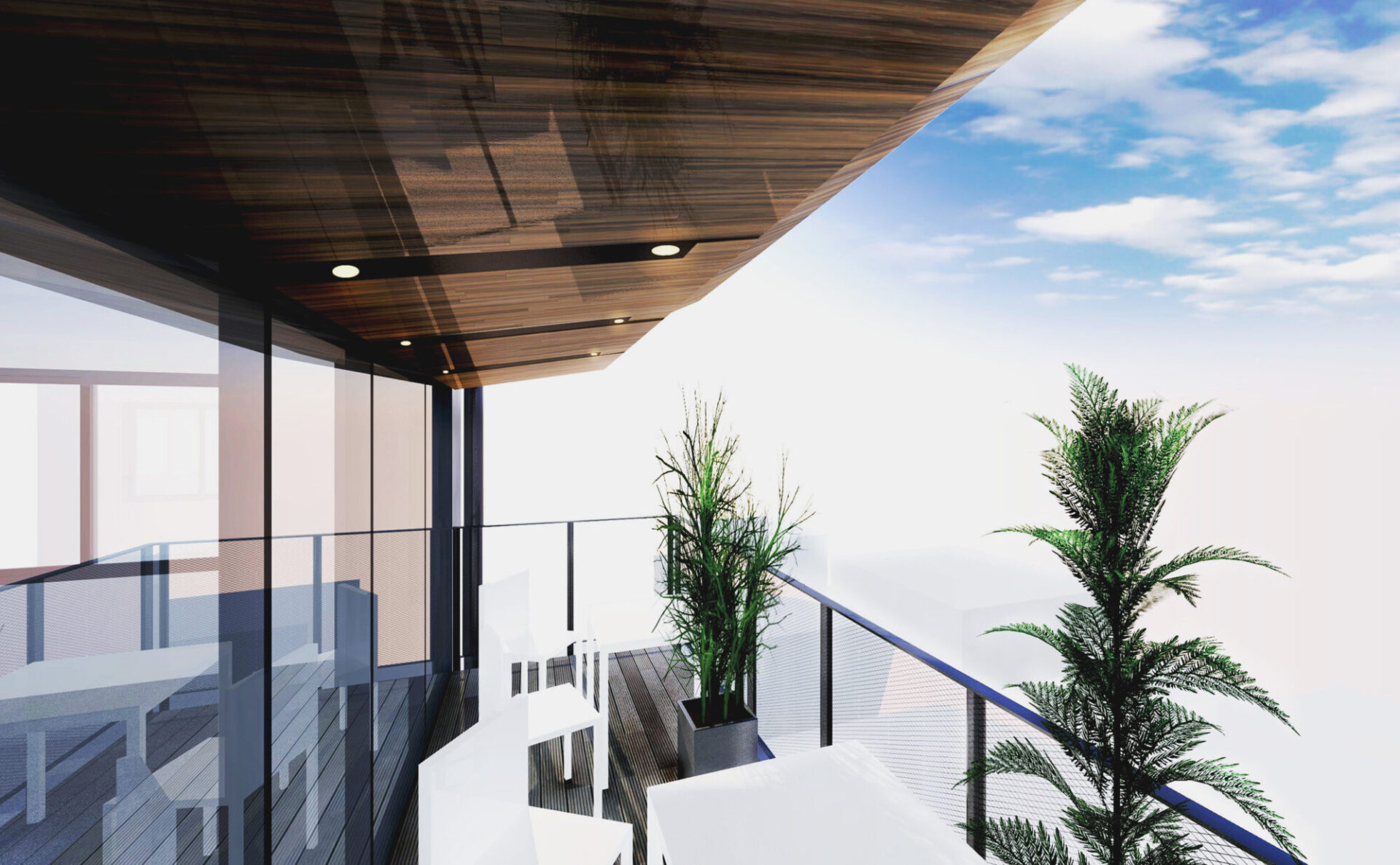 小規模オフィスでは、隅に追いやられるバルコニーをあえて広くとり、外部空間でアウトサイドリビングのようにソファを置いてくつろいだり、外の空気を感じながらゆったり仕事ができる。そんな様子が表れるファサードにした。木調パネルを軒裏に使い、日本人の風土・文化になじみ深く、落ち着くファサードを目指した。